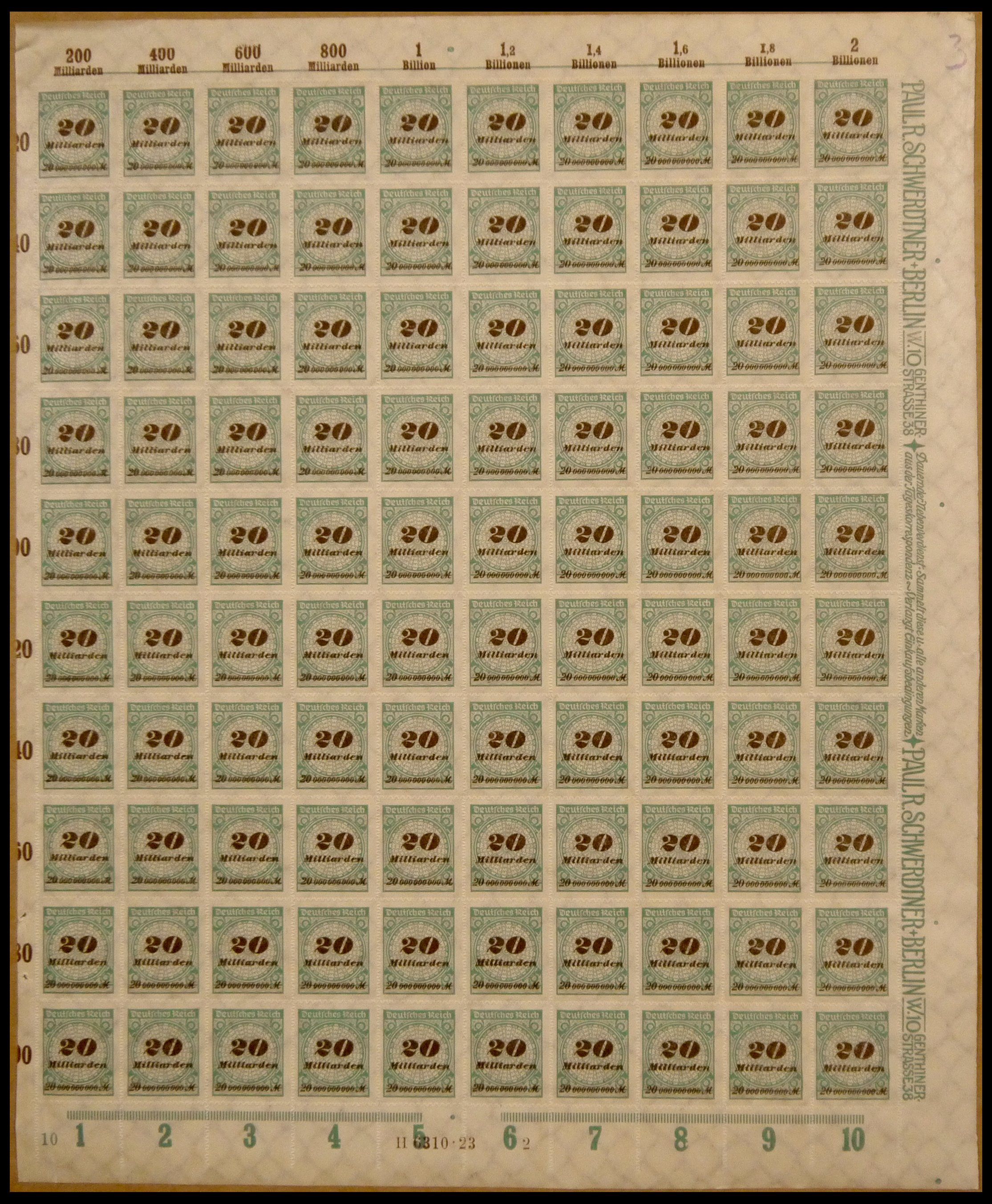 1923, 20 Mrd (Billion). M. opal green / blackish ochre brown, rouletted, in the sheet (100), plate printing C, mint never hinged, superb1923, 20 Mrd. M. opalgrün/schwärzlichockerbraun, durchstochen, im Bogen (100), Plattendruck C, postfrisch, Pracht
