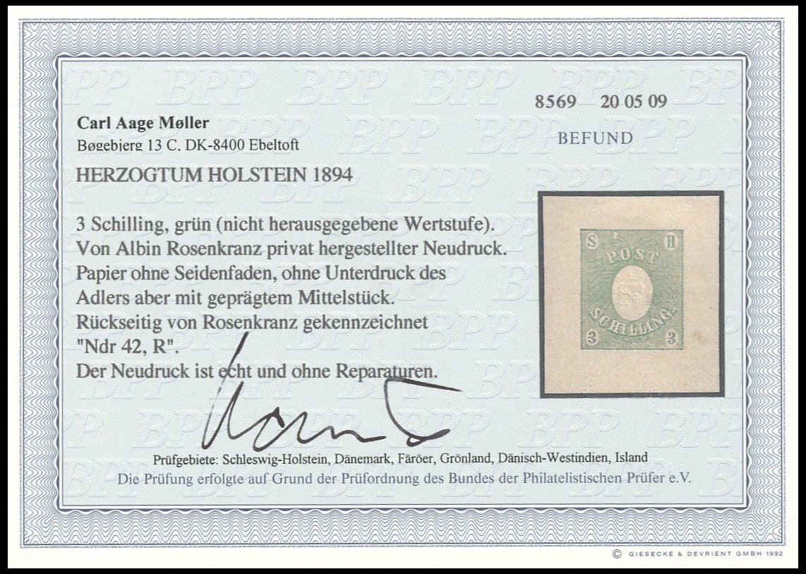 1894, 3 S. grün, privater Neudruck von Albin Rosenkranz, Pracht, R!, Fotobefund C.A. Møller