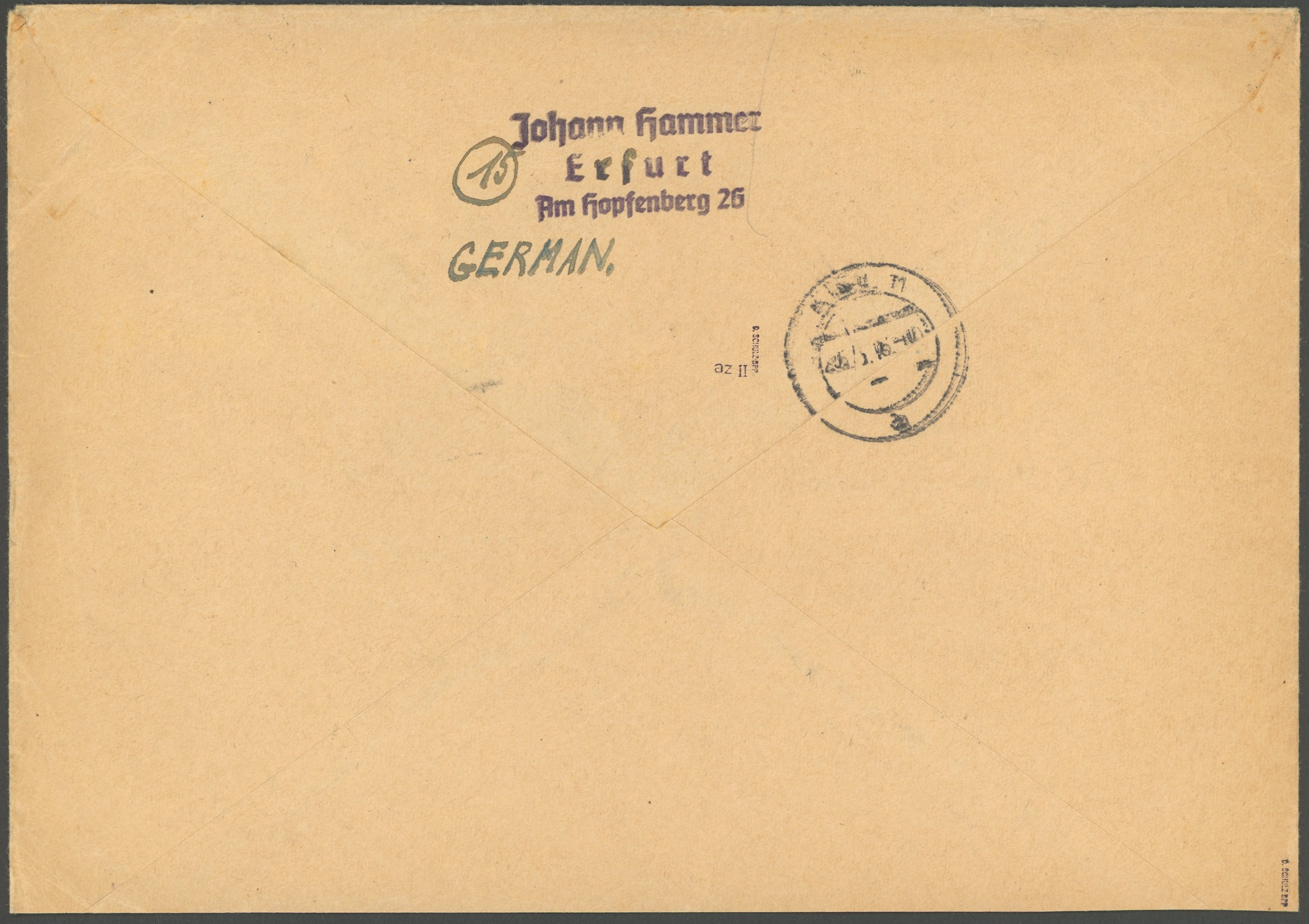 1945, 30 Pf. olive gray, perforated, economy gum, thick paper, falling paper pattern of stripes or streaks, in a horizontal pair with 8 and 40 Pf. I. Control Council issue on registered cover from Erford, superb, expertized Schulz1945, 30 Pf. olivgrau, gezähnt, Spargummierung, dickes Papier, fallende Papierstreifung, im waagerechten Paar mit 8 und 40 Pf. I. Kontrollratsausgabe auf Einschreibbrief aus "ERFURT", Pracht, gepr. Schulz