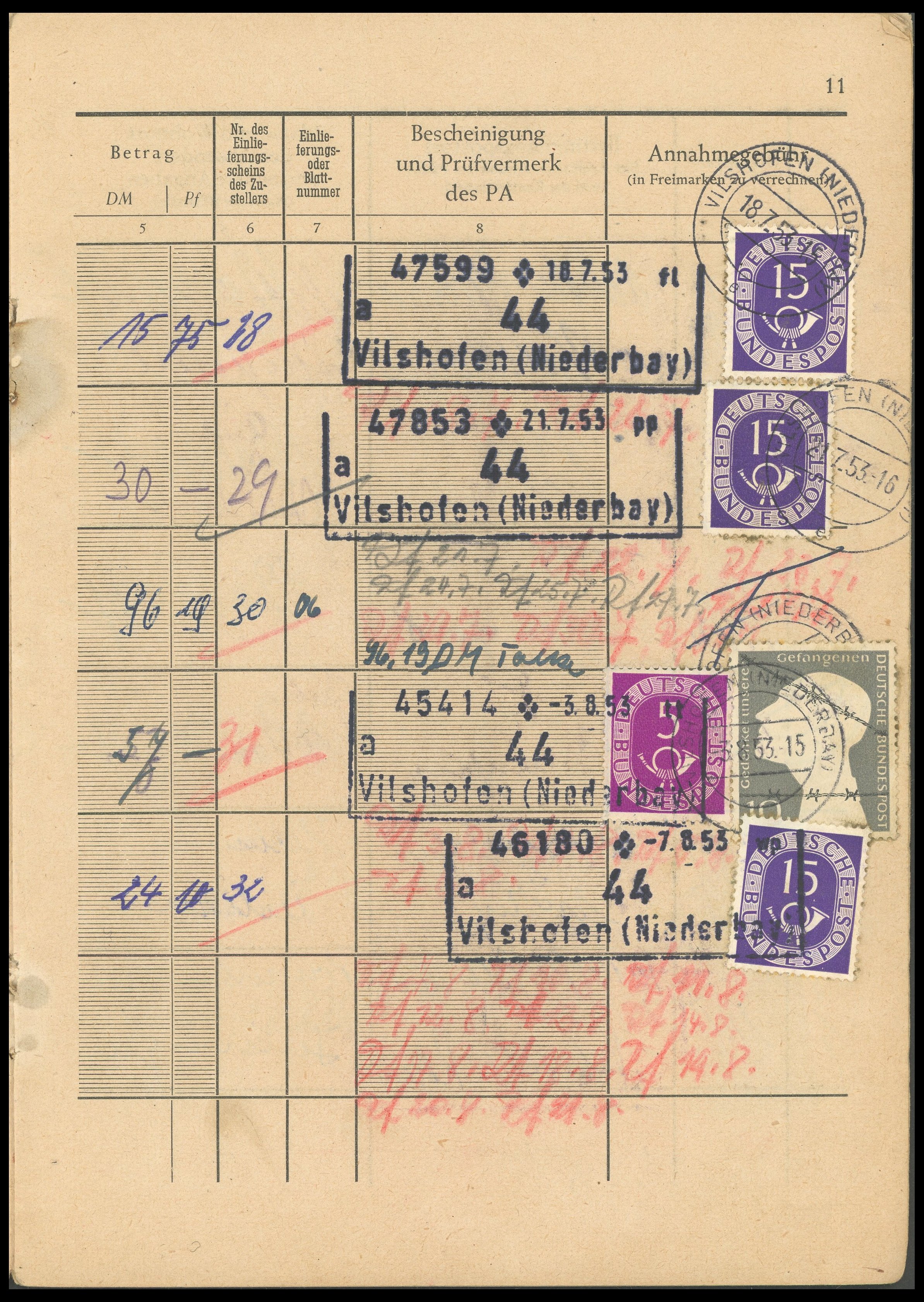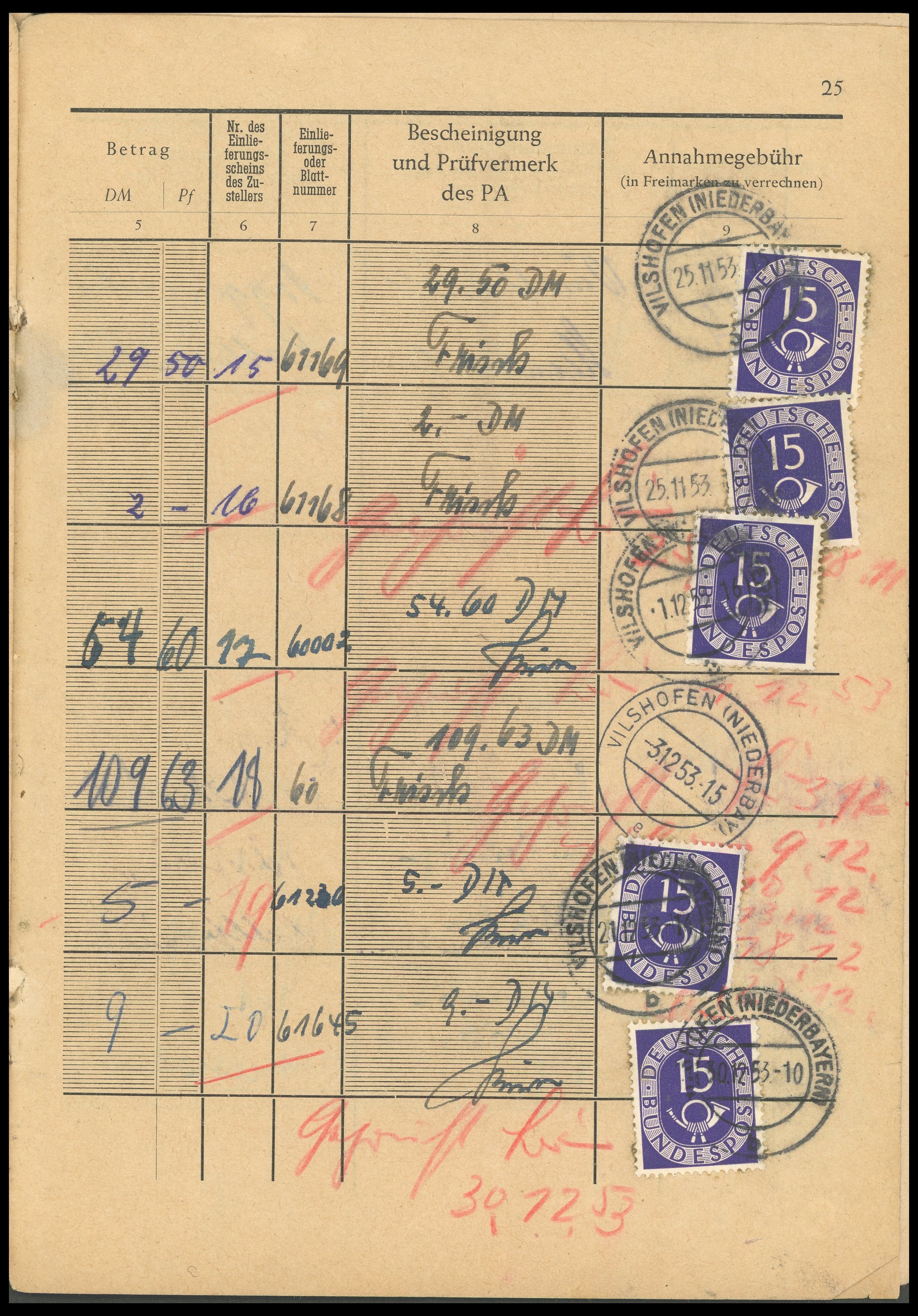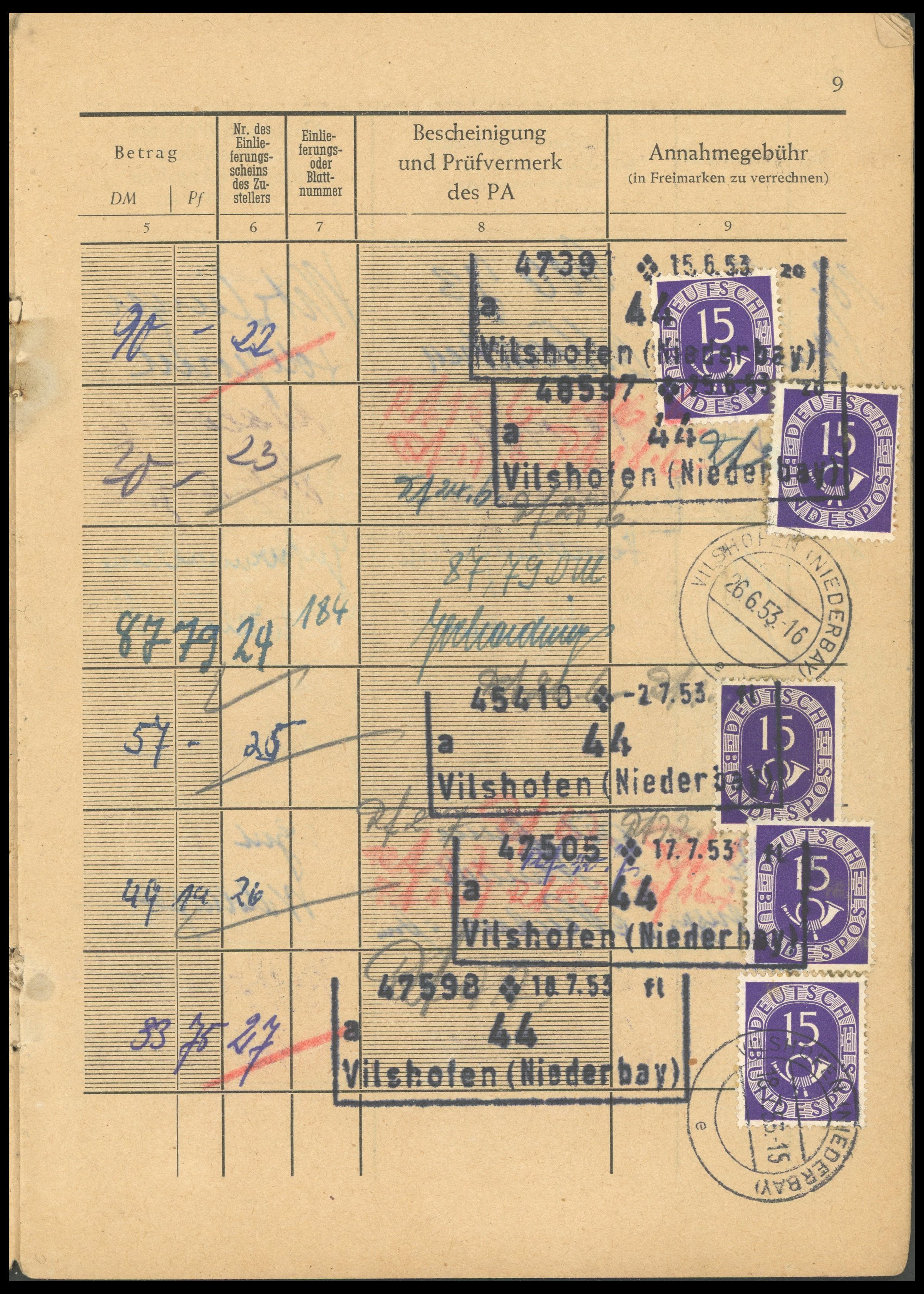 1953 / 4, receipt book (country 4), deliver district Vilshofen, 32 sides complete, the charges were almost only with 15 Pf. posthorn cleared, superb1953/4, Annahmebuch (Land 4), Zustellbezirk Vilshofen, 32 Seiten komplett, die Gebühren wurden fast nur mit 15 Pf. Posthorn verrechnet, Pracht