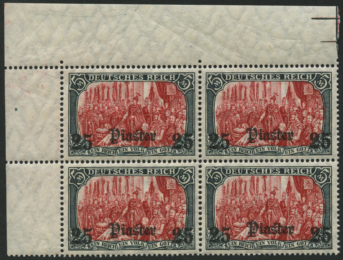 1908, 25 Pia. on 5 M., watermarked, carmine fluorescent, mint never hinged, in the upper right corner margin block of four, mint never hinged, superb, Michel (400.-)1908, 25 Pia. auf 5 M., mit Wz., karmin quarzend, postfrisch, im oberen rechten Eckrandviererblock, postfrisch, Pracht, Mi. (400.-)