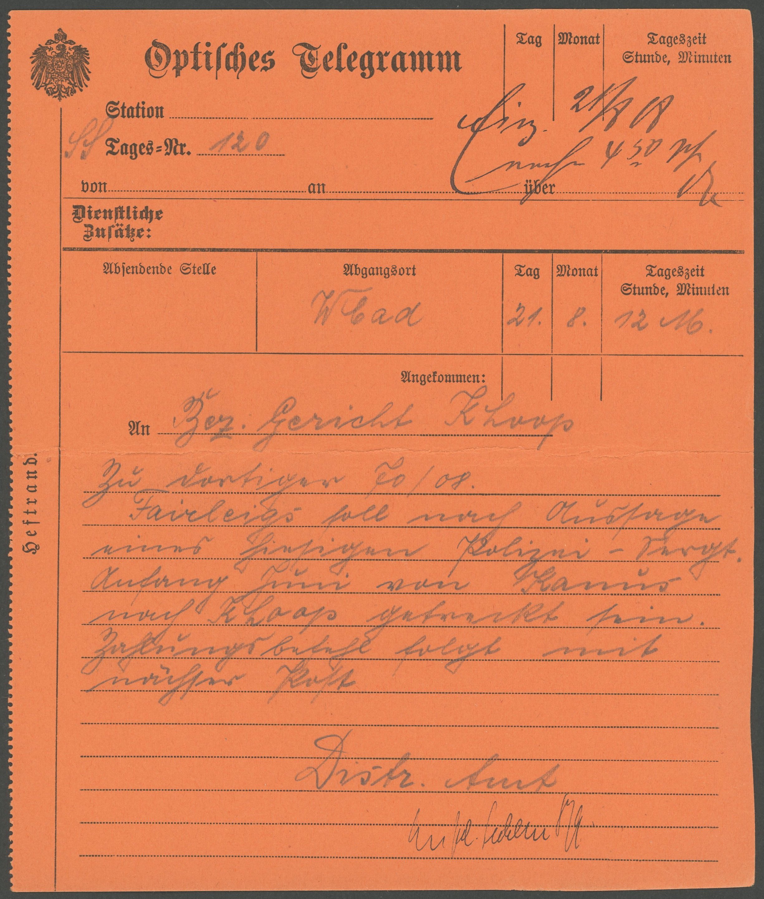 21.8.1908, optical telegram in dark orange from warm bath to the Court in Keetmanshoop, superb, R!