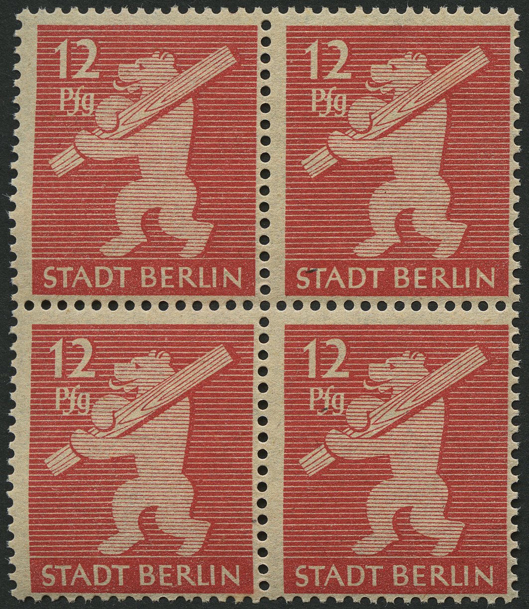 1945, 12 Pf. medium carmine red, gray rose paper, smooth gum, in the block of four, mint never hinged, superb, expertized Zierer, Michel 760.-1945, 12 Pf. mittelkarminrot, graurosa Papier, glatter Gummi, im Viererblock, postfrisch, Pracht, gepr. Zierer, Mi. 760.-